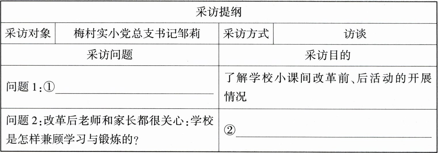 | 问题 1:①______ | 了解学校小课间改革前、后活动的开展情况 |
