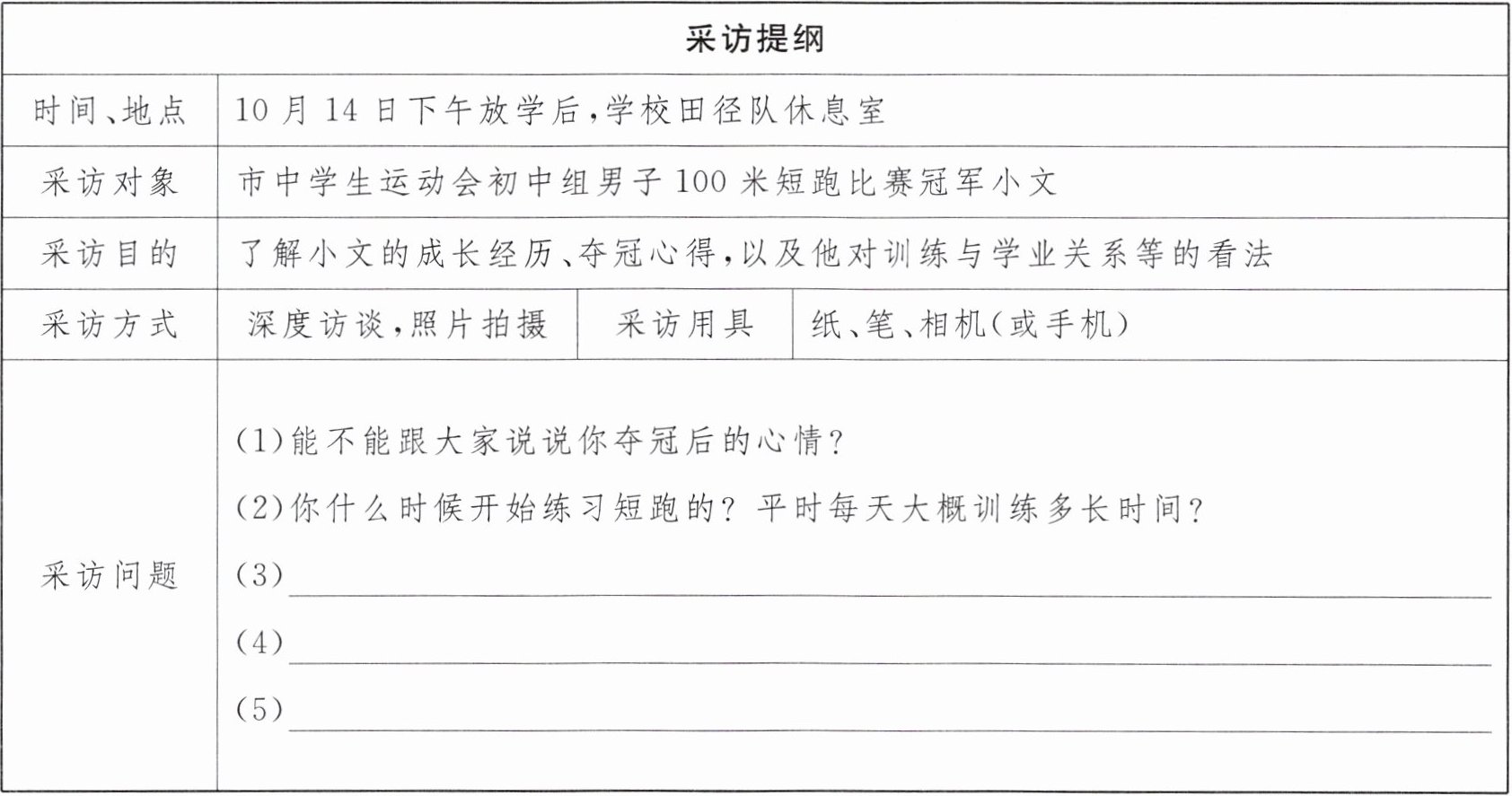 2.(3)【示例】你觉得训练中最艰难的事是什么? (4)【示例】在男子百米短跑项目中,哪位运动员对你的影响最大? (5)【示例】你认为体育训练对你的成长有什么意义?