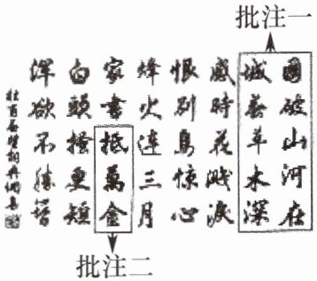5. 小宇在“云上文博馆——典籍馆”看到一幅AI互动诗歌书法作品《春望》,请从下面两个批注中任选一个,帮他完成横线处的内容。