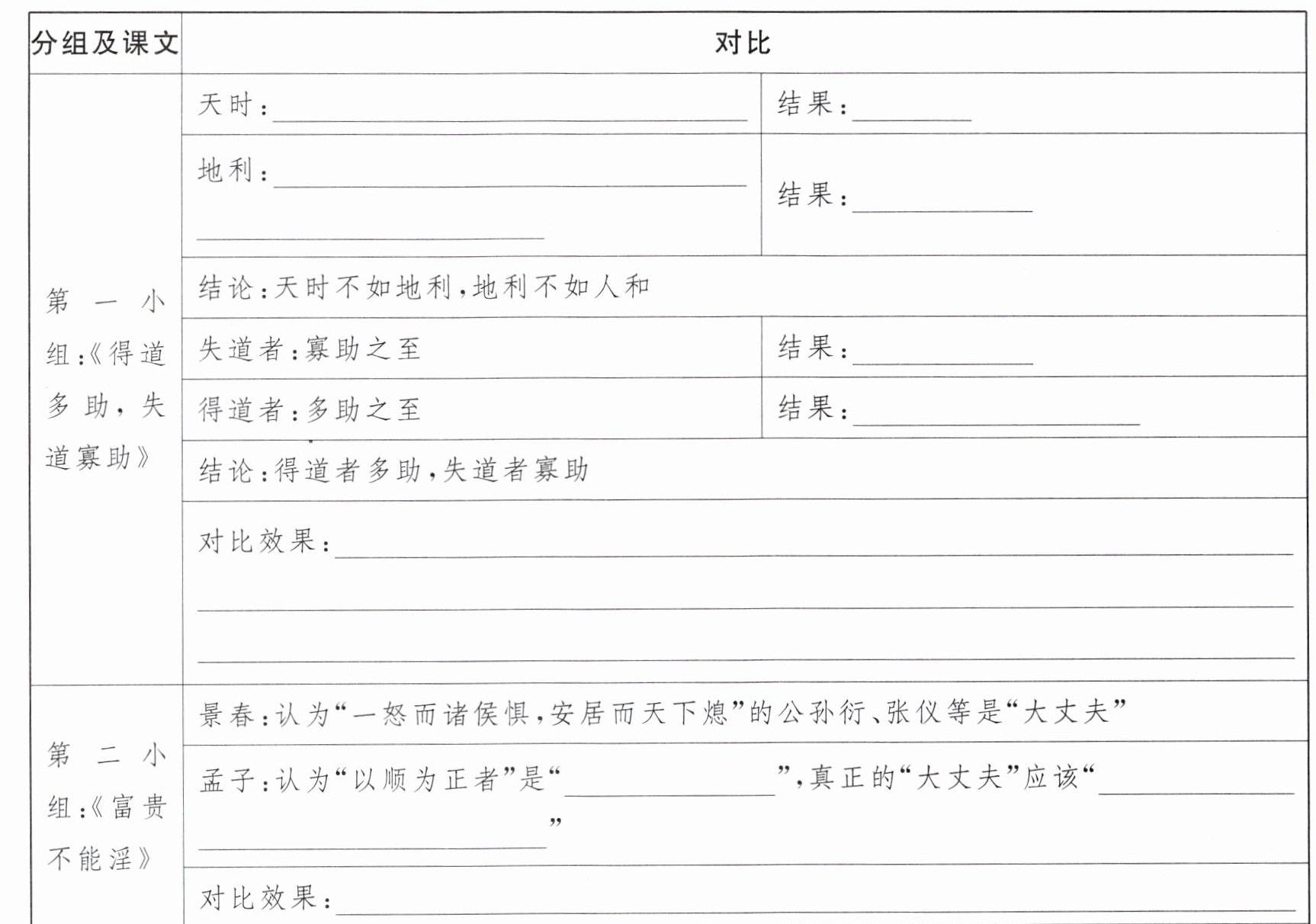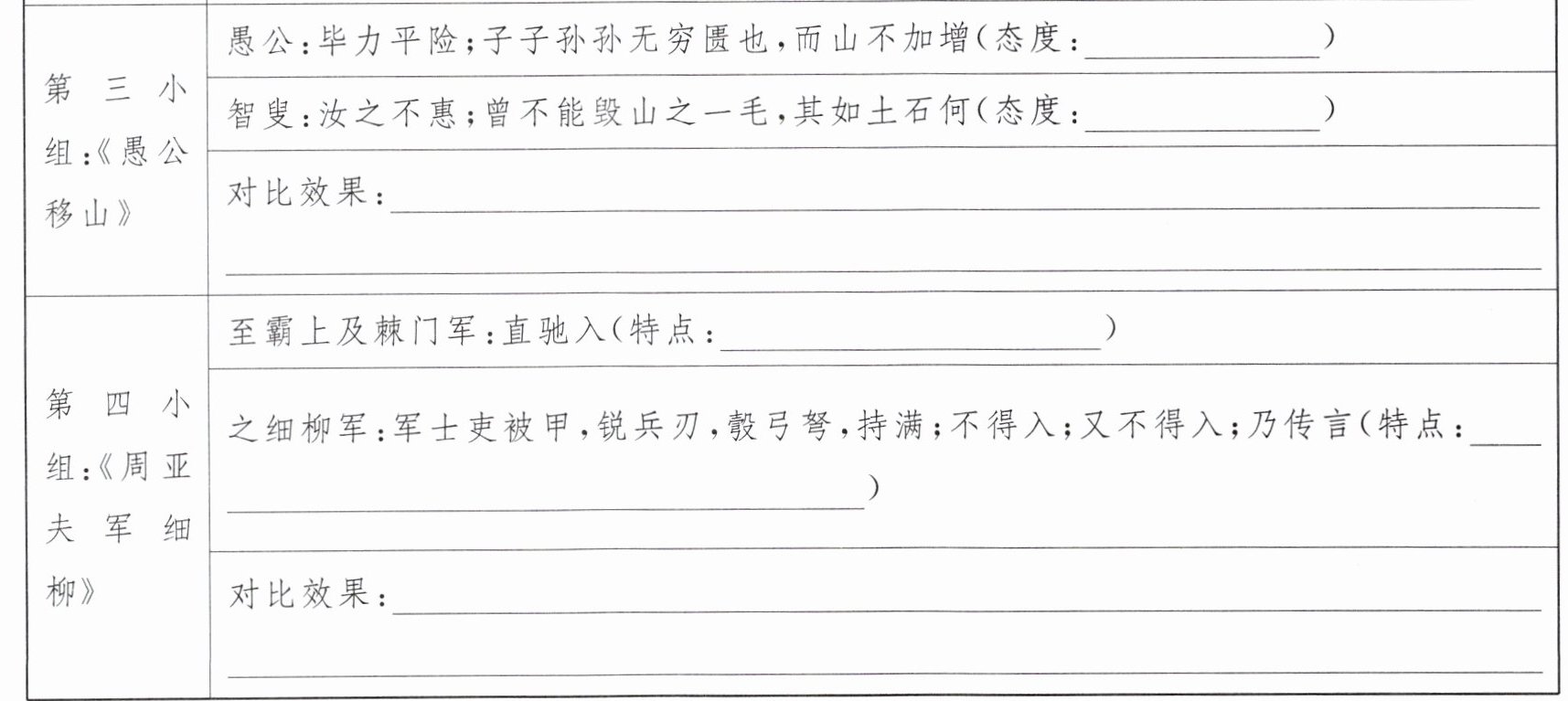 1.请同学们分组梳理本单元文言文中的对比,完成下面的表格。