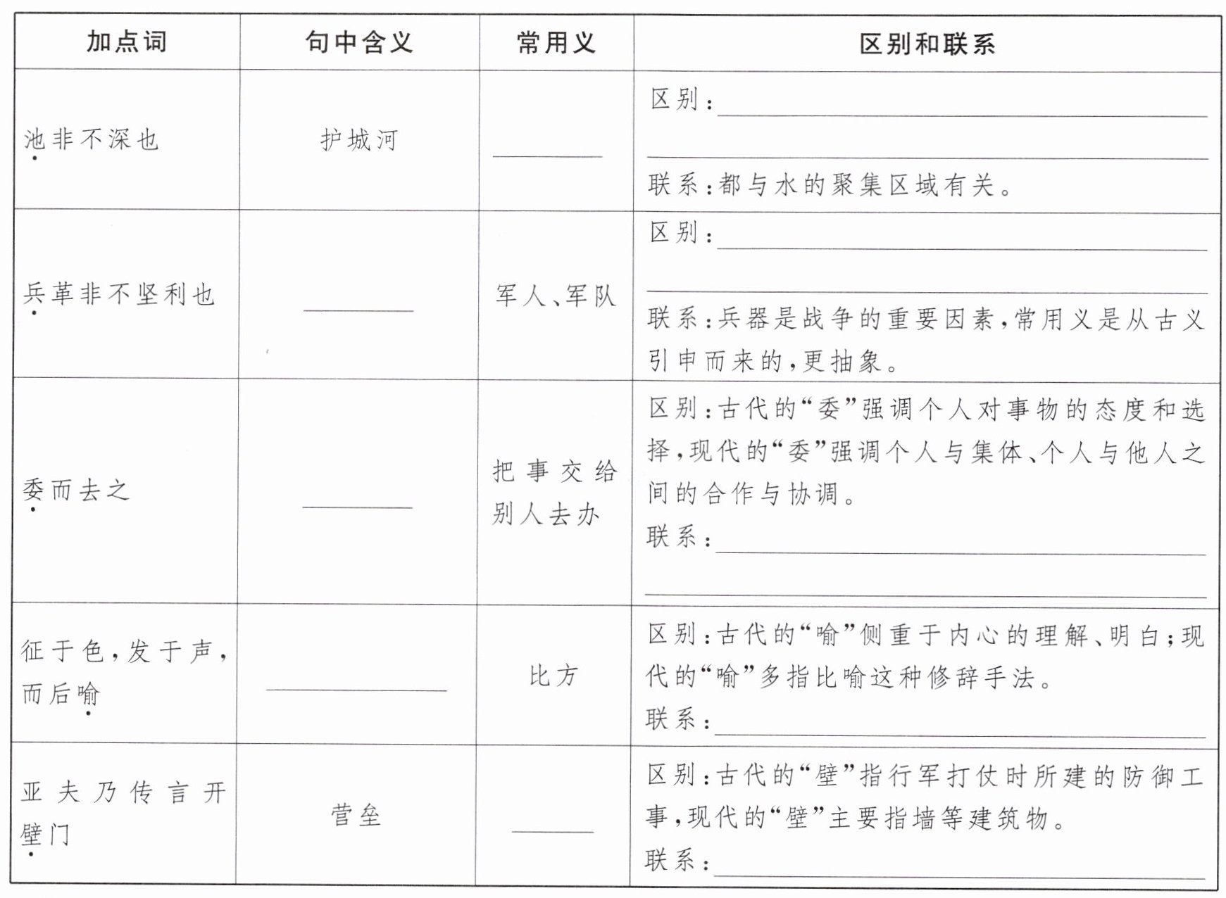 3.第一小组比较了下列加点词的句中含义与它们在现代汉语中的常用义,并找出了它们之间的区别和联系,请你和他们一起把表格补充完整。