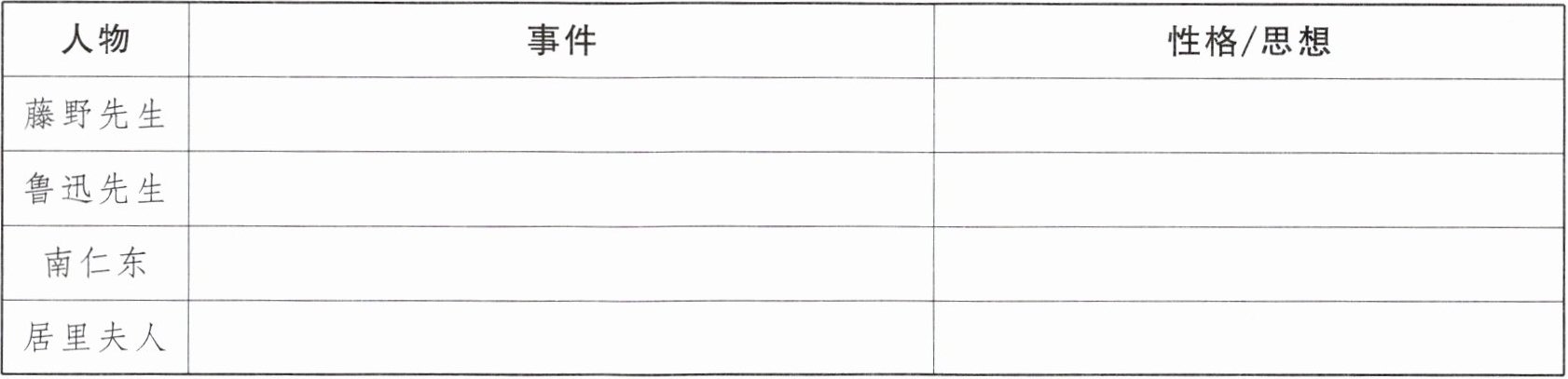 1. 假如你是班级文学专刊负责人物传记板块的编辑,需要为以下四位人物建立“事件素材库”。请从课文中各选取一个典型事件,并说明这些事件分别体现了人物怎样的思想或性格。
