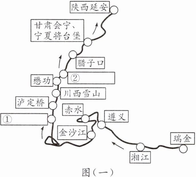(1) 在整理长征相关故事时,小组找到一张长征路线图,请你梳理本书的内容,完成图(一)的填空。