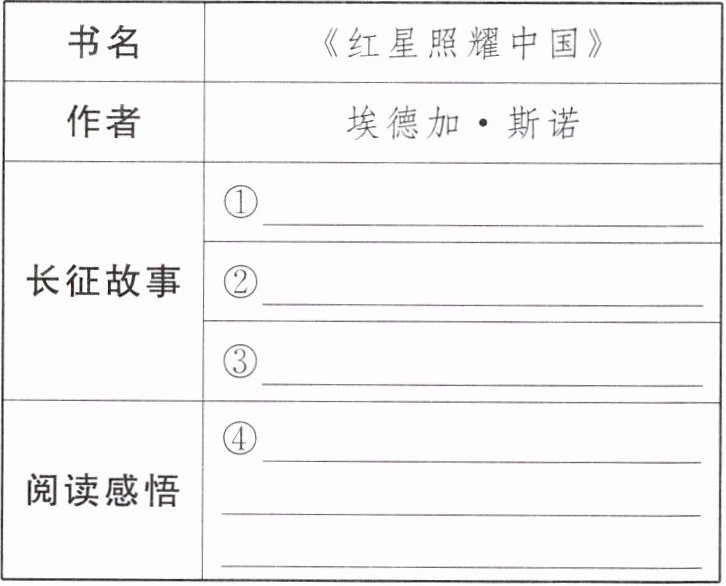 (2) 小组计划出一份以“长征故事促我成长”为主题的班刊,请你根据自己的阅读体验,完成“长征故事”推介卡。