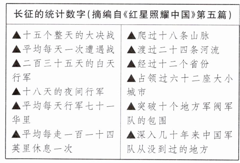 1. 长征是人类战争史上的奇迹,学校要求认真阅读《红星照耀中国》,收集震撼心灵的长征故事。