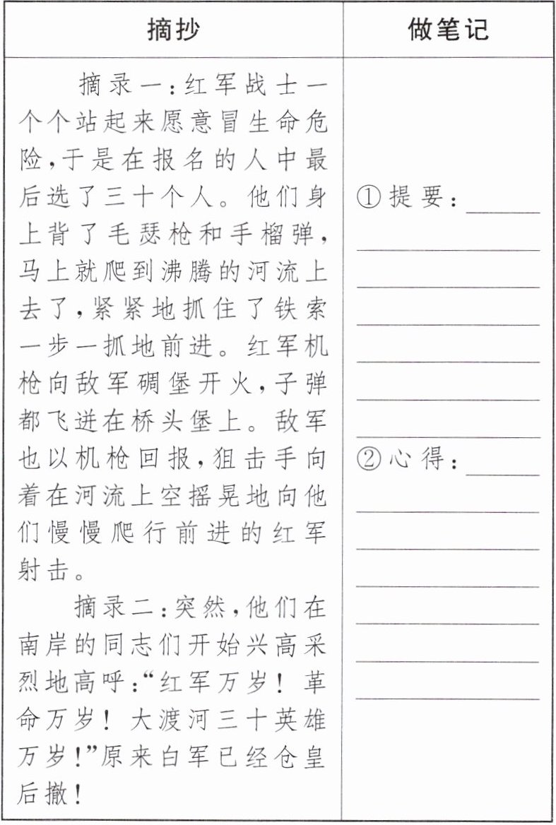 3.①【示例】红军长征经过大渡河时,30名战士临危受命,冒着枪林弹雨,踩着铁链夺下泸定桥 ②【示例】我被红军战士英勇顽强、不怕牺牲的精神震撼,我们应该传承和弘扬伟大的长征精神