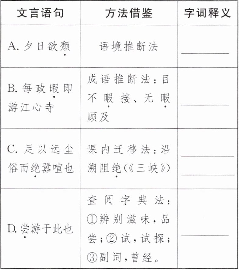 9. 参考表格提示的方法,解释下列句中加点字的意思。(4 分)