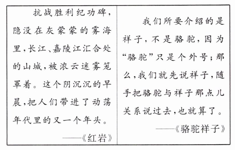 (1)【示例一】我喜欢《红岩》的开头,作者描写了重庆新年早晨被浓云迷雾笼罩的情景,引发人们对动荡年代新一年前景的思考。 【示例二】我喜欢《骆驼祥子》的开头,作者交代了"骆驼"是主人公祥子的外号,文字通俗朴素,读来亲切自然。