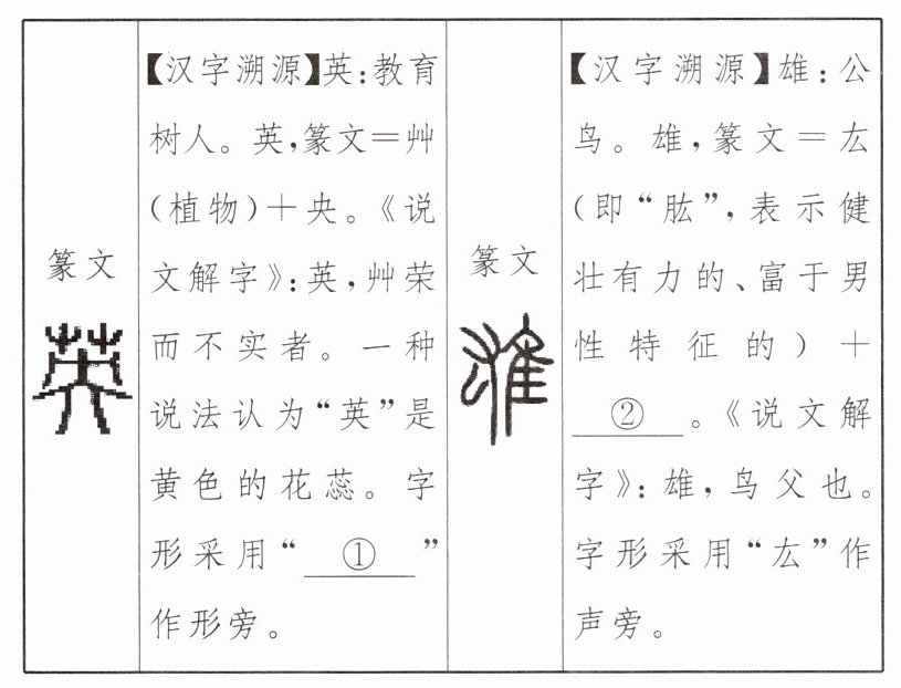 3. 在历史的长河中,烈士用鲜血铸就了和平的基石,他们是当之无愧的英雄。小文为此搜集到了“英”和“雄”的字形演变资料,请你完成下列填空。