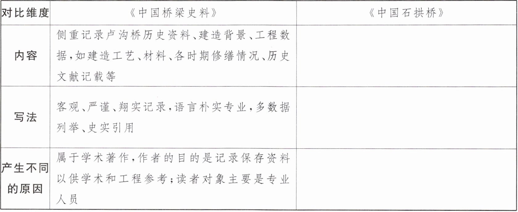 5. 阅读罗英《中国桥梁史料》中对卢沟桥的介绍,对比《中国石拱桥》中的相关内容,看看它们的内容与写法各有什么不同,简要分析产生这些不同的原因。
