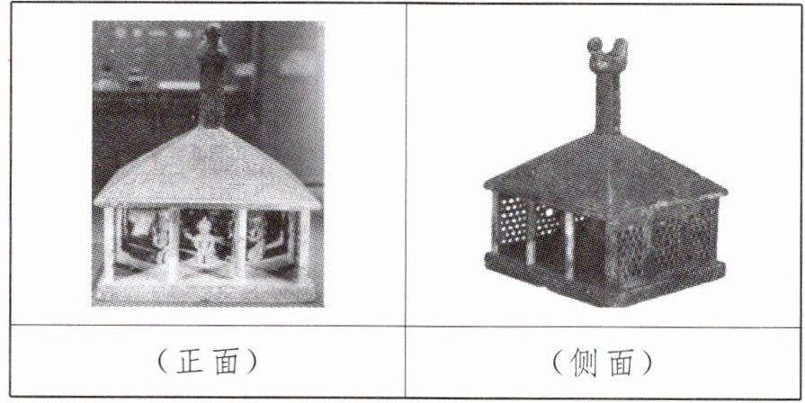 6.【示例】春秋伎乐铜屋整体方正,顶部状似一只小鸟,似乎在“向天而鸣”。中间通过一根立柱相连,底部是一座方正的房屋,屋顶由四块斜坡拼接而成。正面没有墙和门,仅立着两根柱子,其余三面有墙,呈镂空格子状。伎乐铜屋中的奏乐人坐姿端庄,静静地观察它们,似乎还可隐隐闻得笙歌之声。
