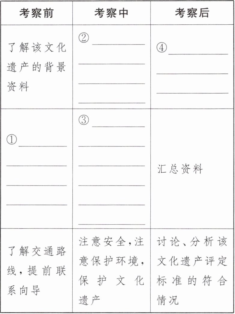 4. 撰写《优秀文化遗产申请报告》需要实地考察,搜集资料。如果要让你进行这方面的工作,你有什么样的计划?请按考察前、考察中、考察后三个方面填写表格。