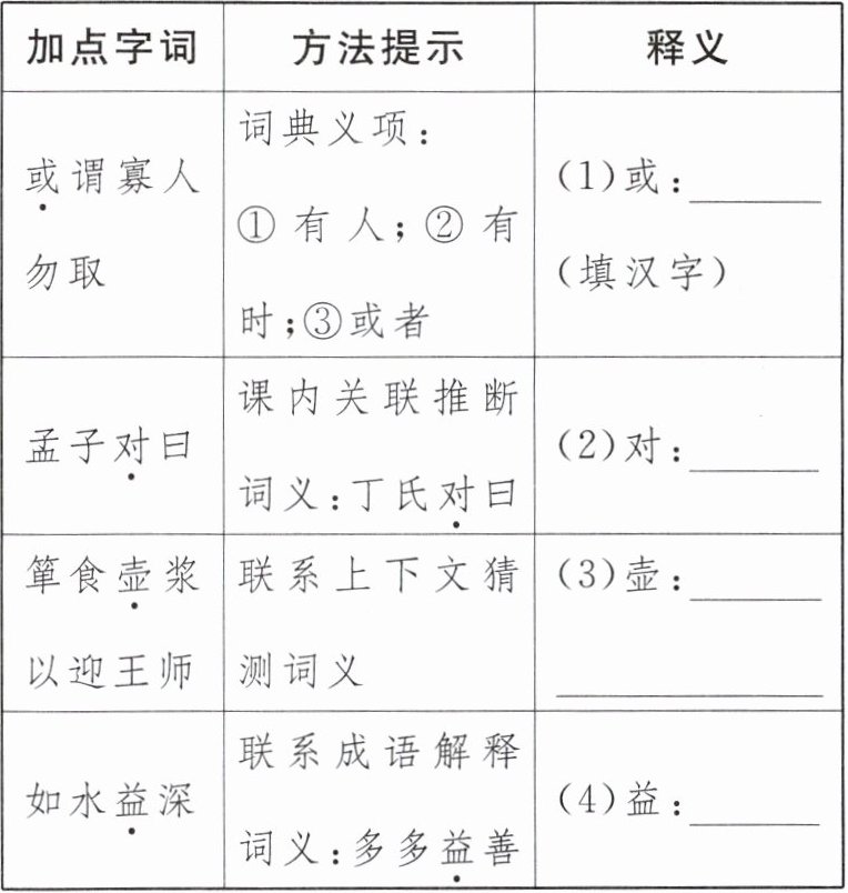 12.(1)有人 (2)回答 (3)用壶盛(装)着 (4)更加 13. D 14.(他们)难道有别的原因吗?(只是想)摆脱水深火热的处境罢了。 15.【示例】孟子并不反对战争。他认为君主应该施行仁政,顺应民心(或追求“人和”),尊重人民的意愿,不违背仁义,这样的战争才会有价值,才能得到百姓的支持。(2 分,意对即可)