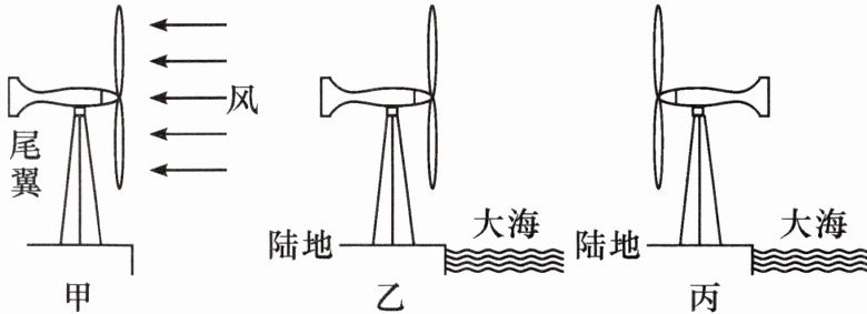 10. (2023·常州)家用小型风力发电机独特的尾翼结构,能使其旋翼自动迎风,如图甲所示。海边,仅在海陆风因素的影响下,图乙、图丙所示的情形通常分别发生在(