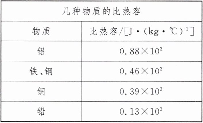 解:由 $ Q=cm\Delta t $ 可得,金属块的比热容:$ c=\frac{Q}{m\Delta t}=\frac{6.6× 10^{4}\ J}{1.5\ kg× 50\ ^{\circ}C}=0.88× 10^{3}\ J/(kg\cdot^{\circ}C) $根据表格的信息可知,该金属可能是铝。