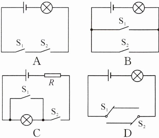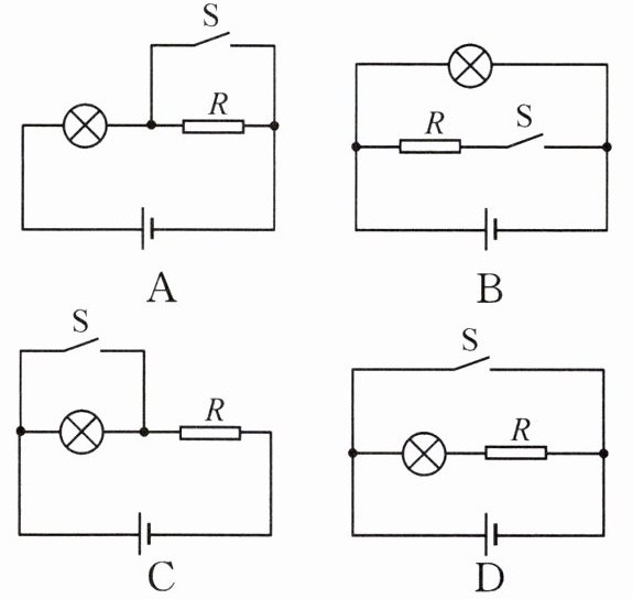 10. (2024·唐山遵化市期中)为了安全, 汽车行驶时驾驶员必须系好安全带。当系好安全带时, 相当于闭合开关, 指示灯不亮; 未系好安全带时, 相当于断开开关, 指示灯发光。符合上述要求的电路图是 (图中 R 为保护电阻) (