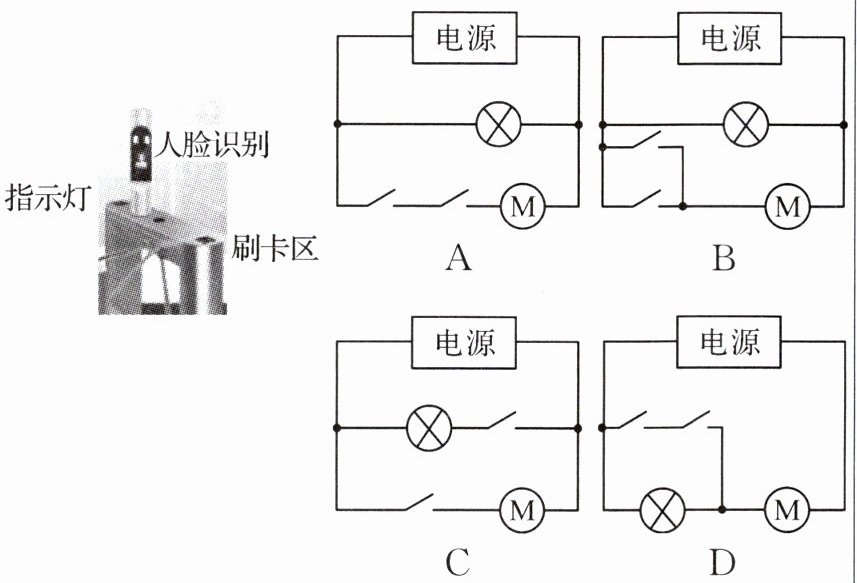 7. (2024·石家庄期中联考)如图为封闭小区常见的智能门禁系统, 住户通过刷卡或人脸识别进入小区, 当门禁系统接通电源后, 指示灯发光。住户刷卡或人脸识别成功时 (相当于分别闭合对应的开关), 电动机工作, 控制门打开。下列关于门禁系统的简化电路设计合理的是 (