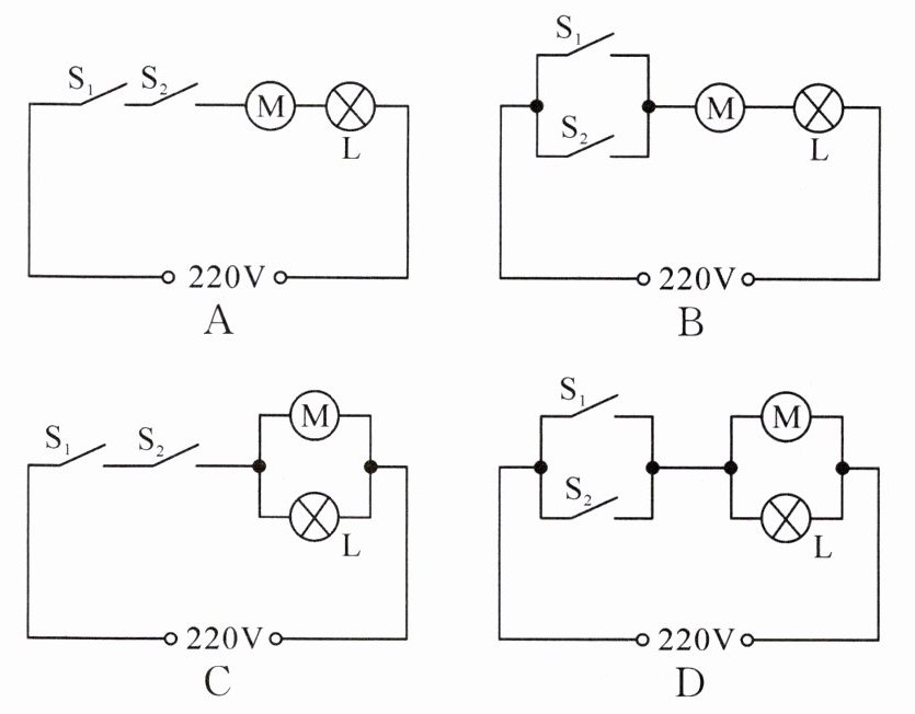 9. 某学校电动门既可以用遥控器开启, 也可以用按钮开关开启。电动门开启时, 电动机工作, 警示灯 L 亮起。若取下警示灯 L, 电动机仍能工作, 按下遥控器相当于 $ S_1 $ 闭合, 按下按钮开关相当于 $ S_2 $ 闭合, 符合上述要求的电路是 (