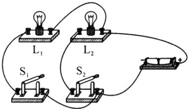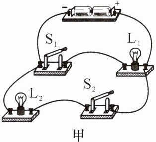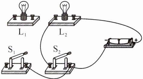 16. 完成如图所示电路连接,要求两灯并联,开关S₁控制L₁,开关S₂控制L₂。