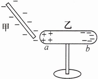 13. 如图所示,当一个带负电的物体甲靠近不带电的金属导体乙时,乙的a端会带正电、b端会带负电。发生上述现象的原因:金属导体中存在大量可移动的自由电子,电子带