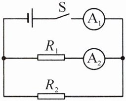 12. (2024·重庆B卷)将阻值为10Ω的电阻$R_1$与另一电阻$R_2$接入电路,如图所示。闭合开关S,电流表$A_1$的示数为0.45A,电流表$A_2$的示数为0.3A。求: