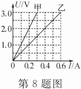 8. 定值电阻甲和乙中的电流与其两端的电压关系如图所示,由图像可得: