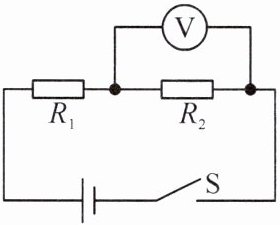 6. 如图所示,电源电压恒为 12 V,电阻$R_{1}$为 20 Ω,当开关 S 闭合后,电压表的示数为 8 V,则电阻$R_{1}$两端的电压为