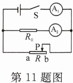 11. 如图所示,电源电压为 $ 3 V $,$ R_0 $ 的阻值为 $ 5 \Omega $,滑动变阻器 $ R $ 的最大阻值为 $ 10 \Omega $,$ a $、$ b $ 为滑动变阻器两个端点。闭合开关,下列说法正确的是(