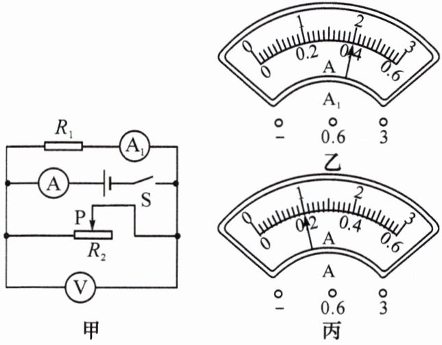 13. 在图甲所示的电路中,电源电压保持不变,滑动变阻器 $ R_2 $ 上标有“$ 20 \Omega $ $ 2 A $”字样,闭合开关后,当滑动变阻器的滑片 $ P $ 在中点位置时,电流表 $ A_1 $、$ A $ 的示数分别如图乙、丙所示,求:
