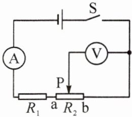 12. 如图所示,滑动变阻器 $ R_2 $ 的最大阻值与定值电阻 $ R_1 $ 相等。闭合开关 $ S $,当滑片 $ P $ 在 $ a $ 端时,电压表示数为 $ 2 V $,则电源电压为