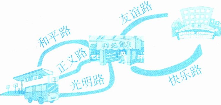 从汽车站到商店有和平路、正义路、光明路共3条路线,从商店到学校有友谊路、快乐路共2条路线。