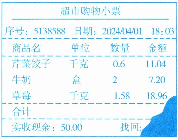1. 你能算出购物小票上找回的钱数吗?试试看。