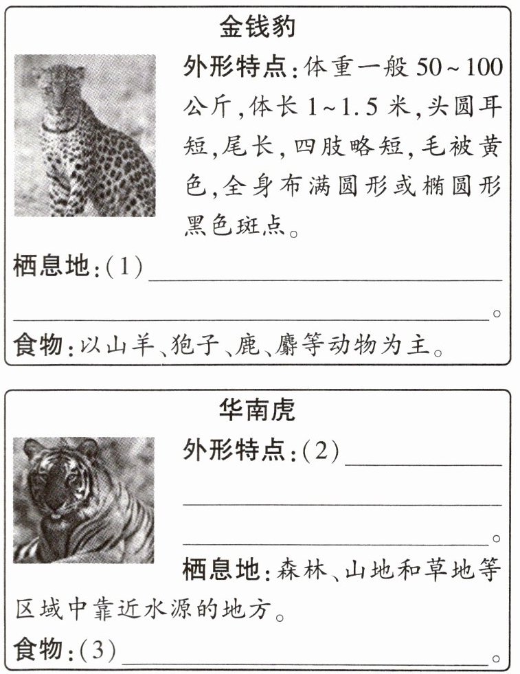 【材料一】金钱豹体重一般50~100公斤,体长1~1.5米,头圆耳短,尾长,四肢略短,毛被黄色,全身布满圆形或椭圆形黑色斑点,因斑点形似中国古代的金属钱币,故得名“金钱豹”。金钱豹生活于山地、森林、丘陵、灌丛、荒漠、草原等多种环境中,它的巢穴比较固定,多筑于浓密树丛、灌丛或岩洞中。金钱豹以山羊、狍子、鹿、麝、麂、野猪、野兔、猴类等为主要食物。