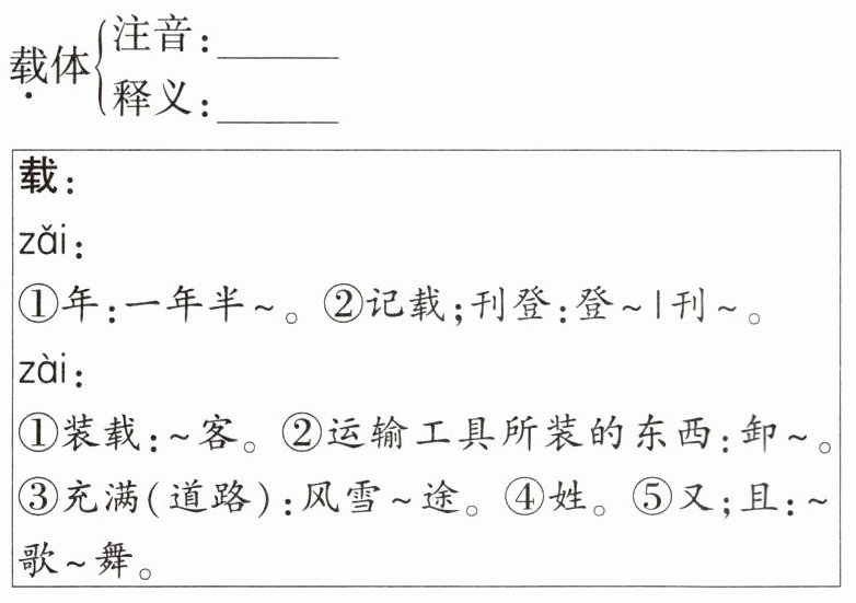 (1)(中考新考法·提供知识支架)请根据《现代汉语词典》(第7版)中“载”的词条,给下面的加点字注音并填写其释义。(2分)