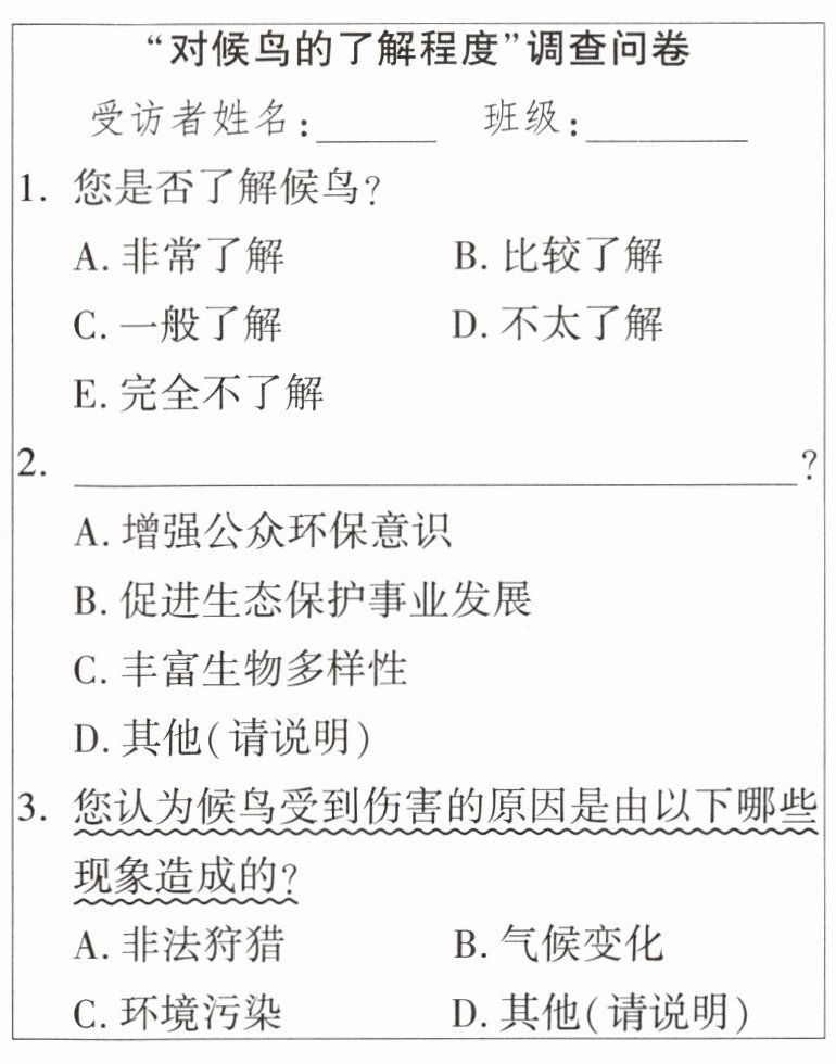 2. 为清楚同学们对候鸟的了解程度,小唯设计了下面的调查问卷。请你帮助小唯修改完善。(4 分)