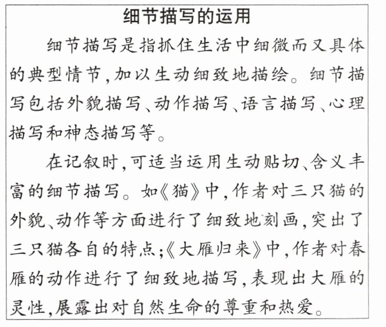一、请你回忆观察动物以及与动物相处时,强烈触动你的细节,运用下面的写作手法,拟写一个150字左右的片段,在交流会上分享。