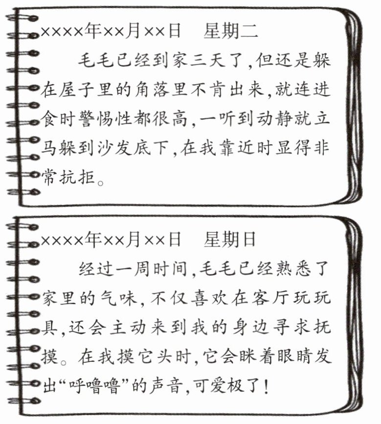 题目:毛毛成长记{名字:毛毛来历:小区的流浪猫相处过程:从一开始的胆小警惕到最后适应了新环境现状:喜欢和"我"亲近毛毛成长记“喵~”,循着一声弱不可闻的猫叫声,我在小区楼下的草丛中发现了一只瘦骨嶙峋的小猫咪。它身上的毛脏污打结,走起路来摇摇晃晃,看起来十分可怜,于是我和妈妈将它带回了家。我给这只小猫取名叫“毛毛”。刚到家的毛毛非常胆小,总是躲在角落里不敢出来,只有我不在它的视线内时,它才会蹑手蹑脚地出来吃饭。随着时间的推移,毛毛长胖了许多,也逐渐适应了新环境。它在家里肆意奔跑、玩耍,有时候还会主动过来寻求我的抚摸。我摸着它的头,它眯起眼睛,发出“呼噜呼噜”的声音,看起来十分享受。每当这个时候,我的心中就充满了幸福感。