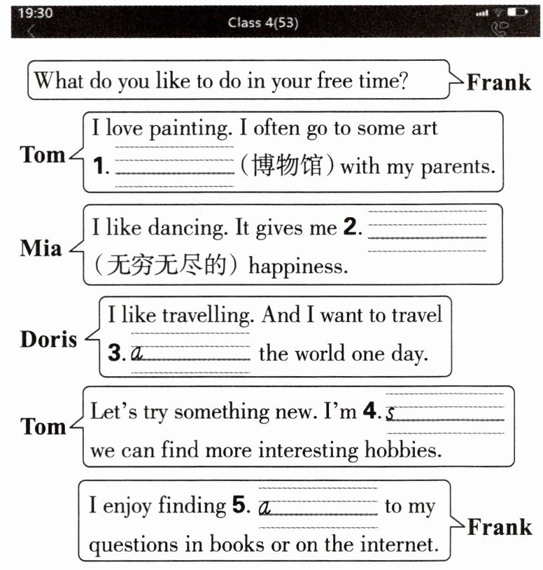 Frank I enjoy finding 5. a______ to my questions in books or on the internet.