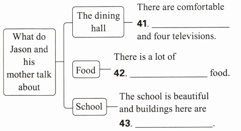38. They are in the dining hall. 39. By watching television/TV. 40. They eat dumplings. 41. chairs 42. healthy and delicious 43. new and clean (with big windows)