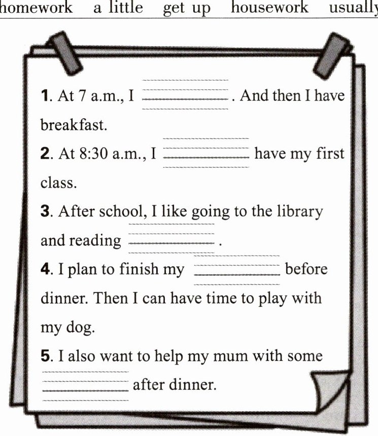 1. get up 2. usually 3. a little 4. homework 5. housework