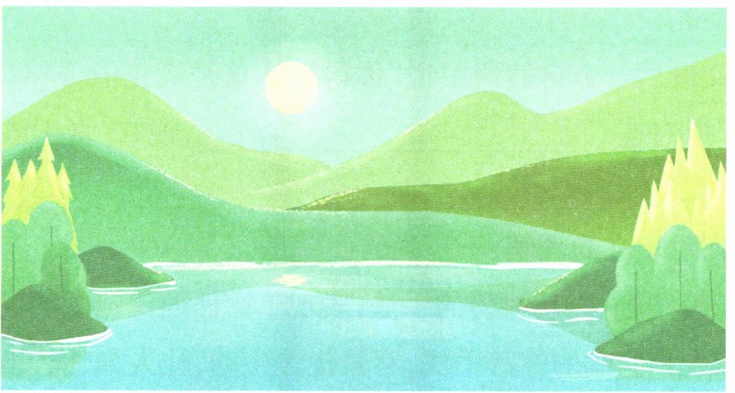 天更亮了,可以看到近处稠密的树叶一片浓郁的绿色。这绿色在你面前越来越浅,一英里①外或更远一点,在下一个伸进河里的岬(jiǎ)角②上,已淡成春天娇柔的嫩绿。再远处的岬角几乎没了颜色,最远处的则在数英里外的地平线下,安静地睡在水面,化为一团氤氲(yīn)氲(yūn)③的雾,与周围的天际连成一片。这一片河面好像一面镜子,映出树叶、曲折的河岸和那些渐渐远去的岬角幽暗的倒影。啊,这真是太美了,那么柔和、浓郁、美丽!