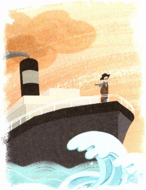 两岸是黄土和青草,再过去是地平线上几座小岛。海水满盈盈的,照在夕阳之下,浪涛像顽皮的小孩子似的跳跃不定,水面上呈现出一片金光。