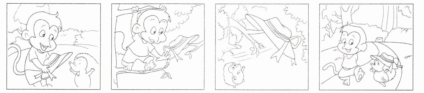 )在美丽的森林里,小猴子和小刺猬是好朋友。有一天,他们正在森林中散步。突然一阵大风刮走了小刺猬的帽子。帽子被吹到了旁边的树上。小猴子爬上树帮小刺猬拿到了帽子。小刺猬拿到帽子非常开心。