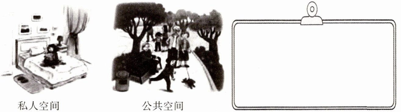 【解析】:私人生活空间是个人或家庭的私密领域,如家中卧室等,在此空间中人们的行为更多受个人习惯和家庭规则影响,相对自由随意;公共生活空间是供社会成员共同使用的场所,如图中的公园等,在此空间中人们的行为需要遵守公共秩序和社会公德,以不影响他人为基本准则。从插图来看,私人空间里人物在床上活动,状态较为放松自在;公共空间里有多人活动,需注意自身行为对他人的影响,比如遛狗等行为应遵守公共规则。