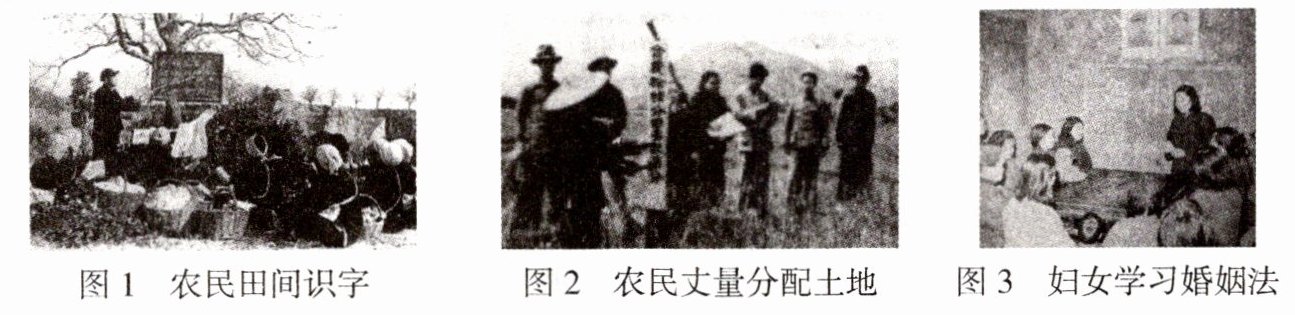 【解析】:题目考查新中国成立初期人民生活变化相关知识点,涉及教育、土地制度和妇女地位等方面。从图1“农民田间识字”可看出教育普及,农民有了学习机会;图2“农民丈量分配土地”反映土地改革使农民获得土地;图3“妇女学习婚姻法”体现妇女地位提升,获得平等权利。