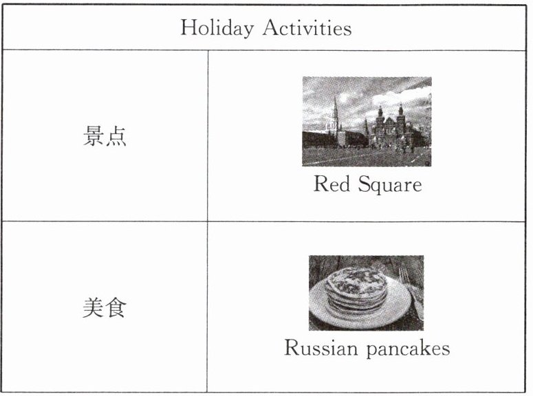 假设你是 Lucy,去年暑假去莫斯科旅游,拍了许多照片。请你根据要点和表格中的照片、提示词,以“My last summer holiday”为题,写一篇约 60 词的英语短文。