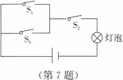 7. 如图,若随机闭合开关$S_{1}$,$S_{2}$,$S_{3}$中的两个,则能让灯泡发光的概率是(