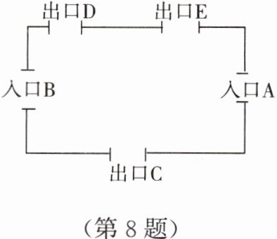 8. 某奥体中心的示意图如图所示,其东、西两面各有一个入口$A$,$B$,南面为出口$C$,北面有两个出口$D$,$E$。聪聪如果任选一个入口进入,再任选一个出口离开,那么他从入口$A$进入并从北面出口离开的概率为(