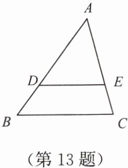 13. 如图,点$D$,$E$分别在$\triangle ABC$的边$AB$,$AC$上,$\frac{AD}{AB}=\frac{AE}{AC}=\frac{DE}{BC}=\frac{2}{3}$,且$\triangle ABC$与$\triangle ADE$的周长之差为$15cm$,求$\triangle ABC$与$\triangle ADE$的周长.