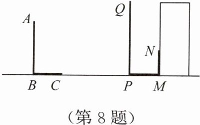 8. 在同一时刻两根竹竿在太阳光下的影子如图所示,其中竹竿AB=2 m,它的影子BC=1.6 m,竹竿PQ的影子有一部分落在了墙上,PM=1.2 m,MN=0.8 m,则竹竿PQ的长度为